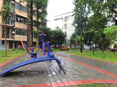 现在,小区入口的右边被改造成游乐健身场所。迎坡而上往右,先经过一个小广场,穿过广场可见一排健身器材立在小游园中,往前走拾级而下,就可见一个篮球场和乒乓球台。