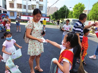 “奶奶,您好,出门记得戴口罩哦。来给您一个口罩。”活动现场,小志愿者刘依涵向没戴口罩的居民发放口罩和创文宣传单。还有的孩子们在家长的带领下,拿着工具清理垃圾。路过的居民看到这些稚嫩的身影,纷纷投来赞许的目光。