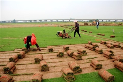 据悉,该基地占地1000亩,育有百慕大、果岭草、马尼拉、台湾青、天堂草和狗牙草等6个品种,每3个月即可收割一轮,刨去各项成本,每亩净收益可达到2000元以上。基地常年吸纳周边40多名村民务工,高峰期日用工量逾百人。