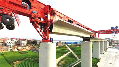 1000吨级高铁箱梁运架一体机由铁五院与中铁十一局集团汉江重工联合研发,是目前我国功能最全的高铁桥梁施工设备,集提梁、运梁、架梁于一体,智能化程度高,可满足24米、32米、40米不同跨度的高铁箱梁施工作业。