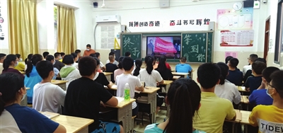 开学第一课上,七八年级学生共同观看了《咸宁市开学第一课》。该校在落实前期九年级复学防控措施的基础上,还根据高温天气特点,开展防溺水、防剧烈运动等安全教育。七年级学生小王表示,尽管开学复课时间不会很长,但是他们依然很期待校园生活。