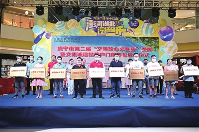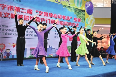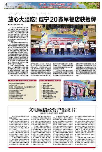 6月28日,咸宁市第二届“文明放心早餐店”授牌暨文明诚信经营户“门前四包”启动仪式在咸宁万达广场举行。市人大常委会副主任镇方松出席授牌仪式。仪式现场,咸安区钰品福禄寿美食阁等10家餐饮店获授牌“文明放心早餐店”,小五热干面等10家早餐店获授牌“人气早餐店”。