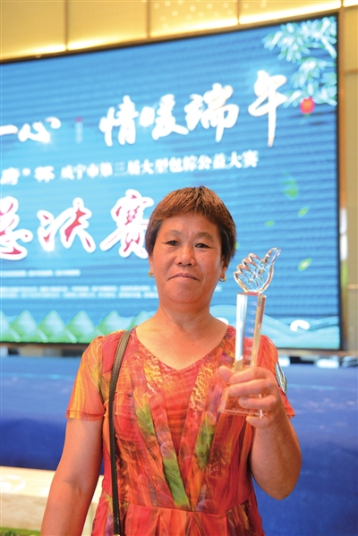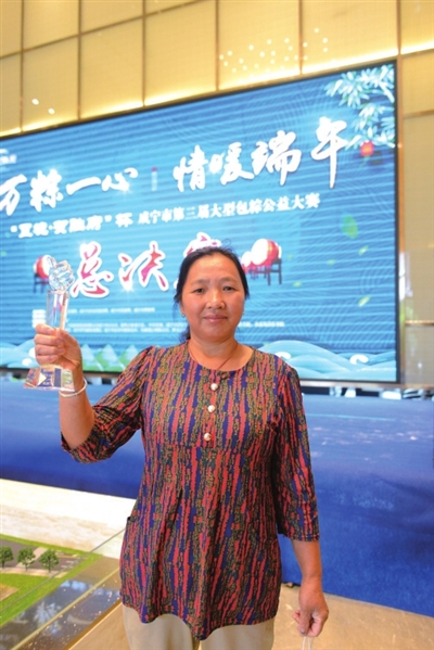 “我每年都参加比赛,年年都获奖了。”今年50岁的罗华荣来自咸安永安街道办事处北正街社区。此次已是她第三次参加包粽公益大赛,每年参赛她都能拿的奖品回家:第一届获得“十佳人气粽王”、第二届获得“十佳香城粽王”,此次比赛她再次“十佳香城粽王”。