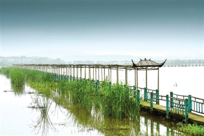 当天,木制钓鱼台上,一位50余岁的游客在休闲小钓。垂竿抛,红烟敛,大有一番“人疑天上坐,鱼似镜中悬”的味道。也有三两游客橹桨戏水,一不小心,惊扰了觅食的鱼儿,“泼刺”一声,慌乱中扑腾至远处,不见踪影。