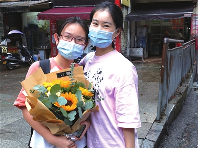 7日上午,在市区红旗路中学考点,出现温馨一幕:妹妹结束考试走出考场,姐姐送上一束鲜花,祝福妹妹考出好成绩。 (记者 吴青朋)