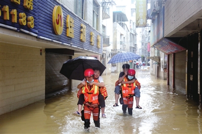 6时10分,崇阳县天城镇中津州社区黄家巷积水高达2米,不少群众被困。该县隽北大道消防救援站接警后,6名消防员立即前往救援。