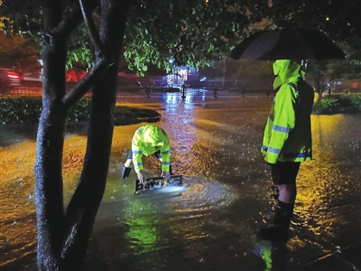 昨日清晨,在市区鄂高考点附近的贺胜路杨下红绿灯积水区域,个别井盖有被水流冲起的危险。市城管执法委市政管理处5名防汛抢险人员第一时间赶到现场,打开雨水篦、窨井盖快速排水,设置围挡、警戒线,安排专人值守,引导过往车辆通行。据悉,高考期间,城管防汛抢险人员彻夜值守、巡查,确保积水路段险情第一时间得到处置。(记者 周阳 通讯员 金清霞)