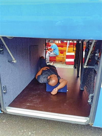 在其中一辆大巴车的行李箱里,一名中年男子正躺着休息。原来,该男子是这辆大巴车的司机,名叫佘才锐。