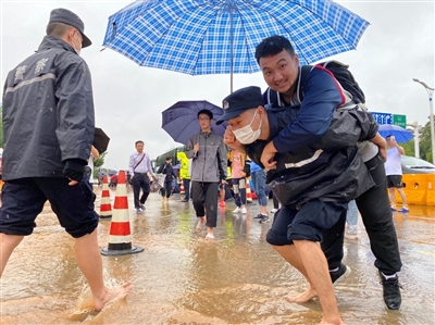 “来,我们背你过去!”来到一个考生身边,董毅蹲下身子说道。背起考生之后,董毅小心地蹚过积水,一直到入口通道处,才将考生放下来。蹚水,背第二个考生……