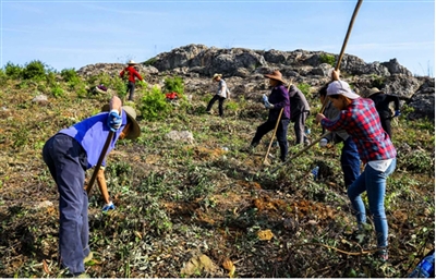 想到村民们的顾虑,卢晓芳下决心褪去“姑娘气”。为此,她多次向村委说明缘由,走访农户,悉心调研,换下裙裾,卷起裤腿,脚蹬“解放”牌胶鞋,义无反顾地投入到大山中,锄头一扛就是三年。淳朴的村民们被晓芳的坚毅打动,开荒队伍逐渐发展到50多人。