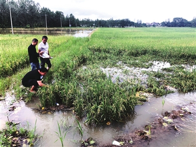 “水稻在受淹4-7昼夜范围内,受淹时间每增加一昼夜,单产会下降一成左右。建议在水退下来后,根据受淹时间长短及稻苗受损程度,决定保苗还是改种。在退水时随退水涝去漂浮物,减少稻苗压伤和苗叶腐烂,防止泥打沙压伤害植株。对倒伏的稻株,要尽量扶正……”了解基地受灾面积、排水灌溉等情况后,市农科领导专家现场探讨对策,将水稻抗灾技术要点耐心向农户解说,指导他们科学开展减灾抗灾工作。