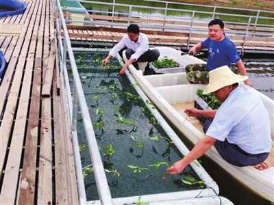 “农高区的池塘零排放圈养试验池塘实施的共生方式是一种直接漂浮法,用网片和PVC管材制作成生物浮床,直接将蔬菜苗固定在浮床上进行水培。”赵伟说,针对水生蔬菜的口感略差的弊端,专家团队正在开展技术攻关,待时机成熟后,市农科院将面向全市推广该技术。