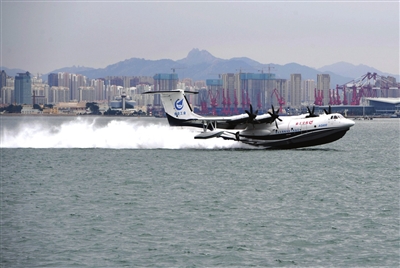 10时14分许,青岛团岛附近海域,AG600飞机逐渐降低高度。一瞬间,飞机的机腹已平稳贴着海面滑行,激起阵阵白色浪花。10时18分许,降落在海面上的AG600,完成机身回转、调整方向,旋即重新加速、机头上昂、腾空而起,在身后留下一道白色的航迹。