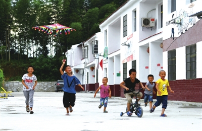 7月18日,在通城县塘湖镇龙印村集中安置点上,少年儿童奔跑在文化广场上。通城县十分注重易地扶贫搬迁集中安置点上贫困户的文化生活,按照一块活动场所、一份绿地、一套公共用房、一套健身器材、一套音响等“五个一”的要求,在易迁点上建有文化健身广场,县里每年还安排送戏、送电影到点上,让贫困户在安居乐业中,享受文化快餐。 (特约记者刘健平)