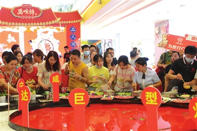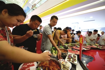 5时许,火锅宴开始了,市民有序排队品尝。“好吃,真好吃!”从万达广场偶然路过的市民金先生吃得停不下来。“我喜欢吃麻辣味的,这里好多菜品都符合我的口味,吃得过瘾。”虽然室内开着空调,但金先生额头已经冒出了一层细细的汗珠。