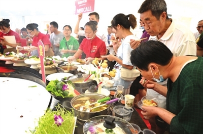 “就是这个味,鲜脆爽口!”王大姐尝了一口,赞不绝口。随后,她随着队伍的脚步,围着巨型火锅转了一圈,分别品尝了德庄、捞旺猪肚鸡、三不牛腩、金滏山的各式招牌菜。