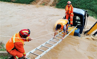 本报讯(记者陈志茹 通讯员朱燕林)暴雨时,一名挖掘机司机正在河道中施工,因河水上涨被困驾驶室。6名消防员快速搭建“生命之桥”,将被困司机成功救出危险地。