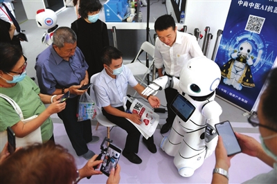 国家会议中心内,不时可见四处“巡视”的智能小机器人,与它们交流互动,可以了解服贸会的相关介绍。此外,有需求的观众拦下机器人,向它说出“请带我去某某展区”,就能获得引路服务。