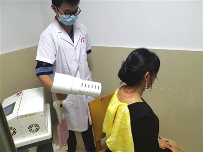 余女士称,自己患有颈椎病十余年历史。近来,自己经常眩晕,颈椎部位反复疼痛。刚开始,余女士像往常一样,进 行了推拿、针灸等传统疗法,但治疗效果并不明显。在科室主任杨伟的建议下,她开始进行“中药熏蒸”疗法。经过近一周的 医治,曾阿姨的病症得到了很大的改善。