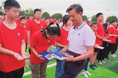 开学典礼上,小学部彭育东校长带领一年级新生举行开笔礼启蒙仪式。领导老师们分别在一年级新生的额头正中点上“朱砂”,为学生启智,现场几百名师生齐诵《三字经》。初中部靳立鸿校长为七年级学生举行赠书仪式,勉励大家读好书,好读书。高中部黎校长组织举行了“封信仪式”,现场高一学生将手写的信件装进信封,由班主任存入学校档案室,留待三年后毕业那一刻重新开启。希望以此信激励同学们不忘初心,坚持拼搏。