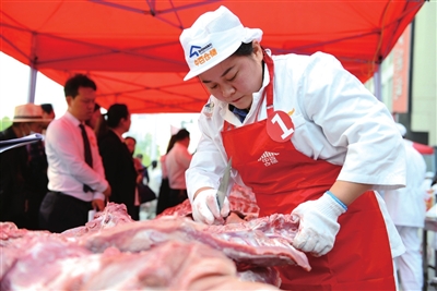 精肉分割比赛区内,选手们一字排开,在规定时间内将一片白条猪肉按规定步骤分解成眉条、通排、大排、带皮前腿等18个品项,随后进行肉食分销、商品分销等,吸引市民驻足观看;计量技能比赛区,选手们进行换纸操作、计量操作、重量预估等,动作有序、娴熟;商品陈列赛区,各个参赛队队员分工协作,将不同品类的商品进行陈列,如变戏法般摆放出一个个美观、大方的造型……各项目赛点上,选手们铆足劲头认真比拼,以稳定的心理素质和良好的精神风貌,赛出了风格和实力。