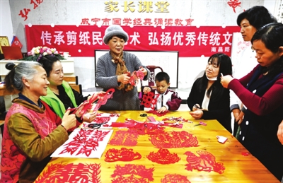 一张红纸、一把剪刀、一双巧手,随着指缝之间的行云流水,一幅幅精美剪纸画呈现在眼前。10月15日下午,在温泉办事处南昌路社区咸宁国学经典诵读教育中心,来自武汉的剪纸艺师林君老师正详细的向社区居民讲解剪纸技巧。