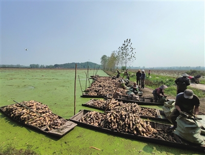 该藕塘是由嘉鱼鸿富农产品加工有限公司孙兵成承包种植的。孙兵成介绍,今年因为降雨,莲藕产量有所降低,预计将比往年减产近50%,该藕塘目前平均每天有30000斤产量,但莲藕品质并没有下降,味道依然清甜可口。 (通讯员 王舒 张忠良 刘奥)