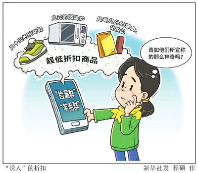 近日,不少消费者反映在各大社交网站、App上出现了一大批以超低折扣商品为卖点的“捡漏群”“羊毛群”等,群主、主播们无不宣称在群里能买到巨大优惠的名牌产品,比如几十元的运动鞋、几元的微波炉、几毛几分的零食、化妆品,甚至还有0元购物机会。宁夏银川市民孙朋说:“类似内容看多了,还真蛮动心的。”