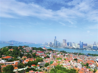 登顶鼓浪屿最高点日光岩,眺望厦鼓全景。鹭江道一带,既有林立的高楼,又有文化底蕴深厚的老建筑,它展现了厦门改革开放发展的成就,又呈现了浓浓的“乡愁”。
