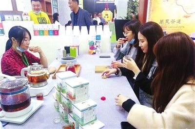 在赤壁市大德和茶业有限责任公司展区,该公司副总经理张铁波说:“现在的青砖茶还分了男人茶、女人茶,针对女性的特别加了玫瑰、菊花,更符合女性的要求了。”