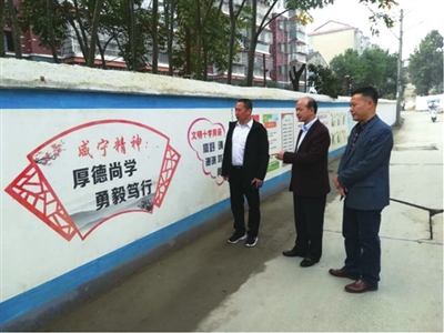 小巷两边的新刷墙面,灰白相映,焕然一新,墙面上喷绘的文明宣传栏内容丰富,色彩斑斓。高新税务一行停驻在喷有“咸宁精神”内容的宣传栏前,细细解读。