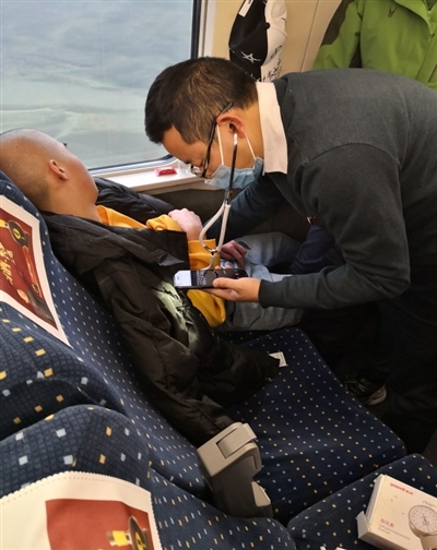 此时,3号车厢里,云南昆明医科大学第三附属医院重症医学科副主任医师付朝江和其他几名队员正在闭目休息。听到广播后,付朝江立刻起身,几步快跑来到4号车厢。距离他的座位大概20米的位置,一位穿着黄色衣服的旅客躺着,正在抽搐。
