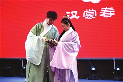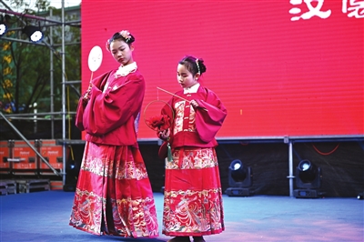 “我愿重回汉唐,再谱盛世华章,着我汉家衣裳,兴我礼仪之邦。”身着齐腰襦裙、明制汉服的少女迈着小碎步,时而掩面微笑,时而向观众行礼,与观众一起重温中华传统礼仪。儿童汉服秀、亲子秀,让观众耳目一 新。
