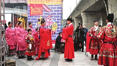 凤冠霞帔,十里红妆;行拜堂礼,饮合卺酒……11月29日下午,由香城都市报、咸宁本土汉服企业“汉裳春”与咸宁汉文化传播社团倾情策划的汉服秀,将万达广场一周年庆活动推向高潮,吸引了众多市民驻足观看,不少汉服爱好者也来到现场“打卡”,体验浓浓“中国风”。