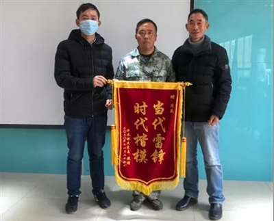 12月4日,在咸宁职业技术学院,嘉鱼县官桥镇村民任火生和任水银将一面绣着“当代雷锋 时代楷模”的锦旗送到退役军人周庆手中,以感谢他对嫂子、母亲的救命之恩。