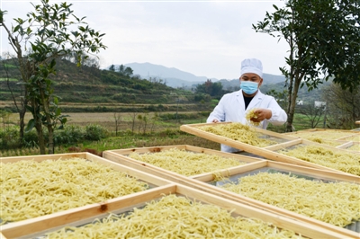 12月6日,在通城县塘湖镇望湖村黄袍山富硒有机稻种植专业合作社,社员在加工、晾晒饼折,通过线上线下销往全国各地。