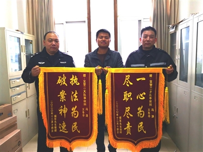本报讯 (记者 方达星 通讯员 阮文玉)12月14日上午,市民镇先生带着两面印有“执法为民、破案神速”“一心为民、尽职尽责”的锦旗来到市公安局交警支队城区大队,对交警快速破案表示感激。