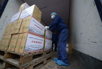 记者在装运现场看到,封装严实的1.5万份赤壁青砖茶打捆堆码在仓库中,叉车忙碌进出将其转运到物流货车上,工作人员井然有序一丝不苟。