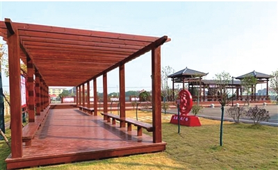 驿站内,公共厕所、停车区、休息亭等功能设施一应俱全。红色的中式法治亭古朴端庄,连廊式样质朴厚重,法制文化墙内容丰富,草坪、石块、绿植点缀其间,在蓝天白云的映衬下,格外秀丽。该“公路驿站”已然成为余码头村人居环境的一大亮点。