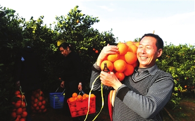 位于半坡的脐橙种植基地,一个个金黄色的大脐橙挂在枝头,照亮了正在采摘果子的杨传清夫妇舒展的笑脸。