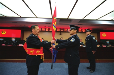 “忠诚的道路浴血荣光,英雄的足迹越走越长……”1月7日,咸宁市公安局举行首届中国人民警察节荣警仪式(今年1月10日是首个中国人民警察节),老中青三代民警齐聚一堂,共话警营岁月,传承荣光开新篇,他们再次唱响这首饱满热情、铿锵有力的《人民警察警歌》。图为退休民警代表将手中紧握的警旗交与新警代表。 记者张仰强通讯员王凡/摄