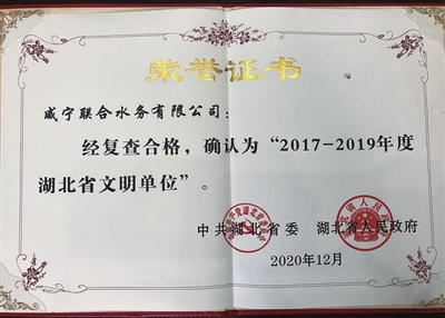 日前,中共湖北省委、湖北省人民政府印发《关于命名表彰2017-2019年度湖北省文明城市、文明村镇、文明单位、文明家庭、文明单位(校园)的决定》,咸宁联合水务再度获得了湖北省2017-2019年度“文明单位”荣誉称号。能够再续此项荣耀称号,是中共湖北省委员会和社会各界对咸宁联合水务长期以来坚持精神文明建设、努力提升文明素养、持续深化文明创建活动的充分肯定。