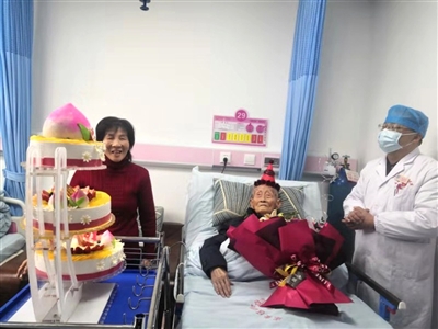 “祝您生日快乐,福如东海,寿比南山!”1月20日上午,咸安区妇幼保健院内科10余名医护人员唱着生日歌,推着生日蛋糕,捧着鲜花,来到何平老人的病房里,为老人庆祝100岁生日。