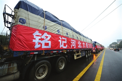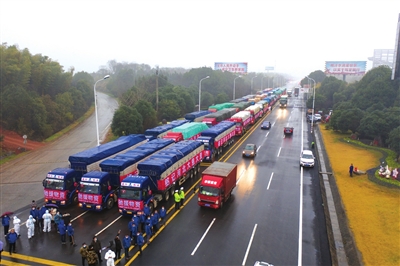 8时40分左右,京港澳高速咸宁北入口处,41辆悬挂“铭记河北大恩大爱”“湖北咸宁为冀加油”等横幅的大货车,从这里出发,火速驰援河北。车上满载的,不仅有价值2000余万元的医疗设备、医用防护、生活用品等物资,还有咸宁人民的牵挂之心。