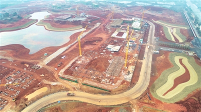 1月26日,武汉东湖学院嘉鱼校区项目施工现场,塔吊林立、机器轰鸣,大型运输车辆来回穿梭,一派繁忙景象。