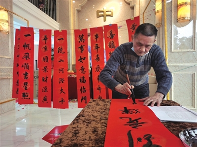据了解,市老年书画家协会十几年来一直坚持开展送书画、送文化到农村、到企业、到社区、到学校、到军营等“六送”活动,以送春联、送文化的方式, 为社区居民送祝福、送温暖,弘扬中国优秀传统文化,丰富人民群众文化生活,营造欢乐祥和新年氛围。 (记者 漆兵)
