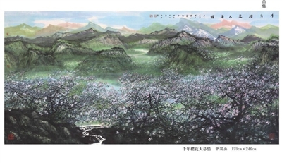 在美术展厅中展出的64幅优秀山水画新作中,六尺及以上大幅作品就有35幅,充分体现了画家们深入咸宁的山山水水写生的生动感受。湖北省美术院原院长、咸宁籍知名画家董继宁先生的作品《千年樱花大幕情》“山势当空出,樱花铺地开”,构图饱满,意蕴绵连,春的气息扑面而来;武汉市美术馆原馆长、咸宁籍知名画家樊枫先生大病初愈挥笔作画,饱醮对故乡深情的画作《依稀故园》线条苍劲有力,气势清旷绝俗;湖北中国画研究院原院长、咸宁通山籍知名画家孔奇先生的作品《富水河畔》用笔轻快,色彩明亮,层次丰富,画面轻盈而不失沉稳,景色朦胧不失灵动;此外,《云中行》《秋水正是九月浓》《碧水翠山春常在》等作品,笔精色妙,意境深远,情趣盎然,充溢着对咸宁自然山水和历史文化的真切热爱。