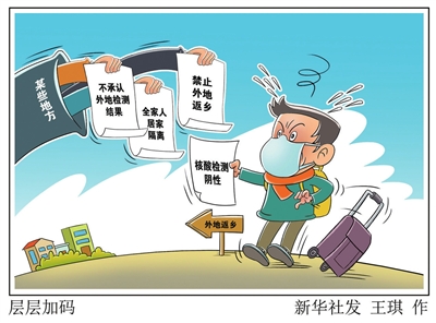 任福燊的遭遇并非个例。有网友如是调侃疫情防控层层加码:“上级政策是持核酸证明低风险地区之间自由通行;到了省里就变成了不承认外地检测结果,需入住指定酒店再检测一次;到了市里就变成了全家人居家隔离14+7,测两次核酸;到了县里就变成了一概别回来……”