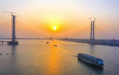 1月29日,赤壁长江公路大桥工地,工人们在紧张有序地施工。该桥南岸滩桥最后一孔50米的现浇箱梁已施工完毕。主跨桥梁也在不断的实现合龙,目前