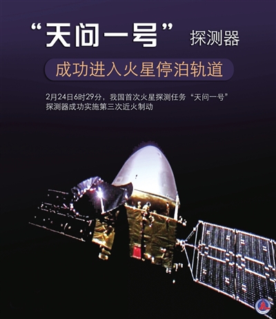 “天问一号”自2020年7月23日成功发射以来,已在轨飞行215天,距离地球2.12亿千米。2021年2月10日探测器进入环火轨道,于2月15日实施了远火点轨道平面机动,2月20日实施了第二次近火制动,目前设备状态正常,各项飞控工作正常开展。